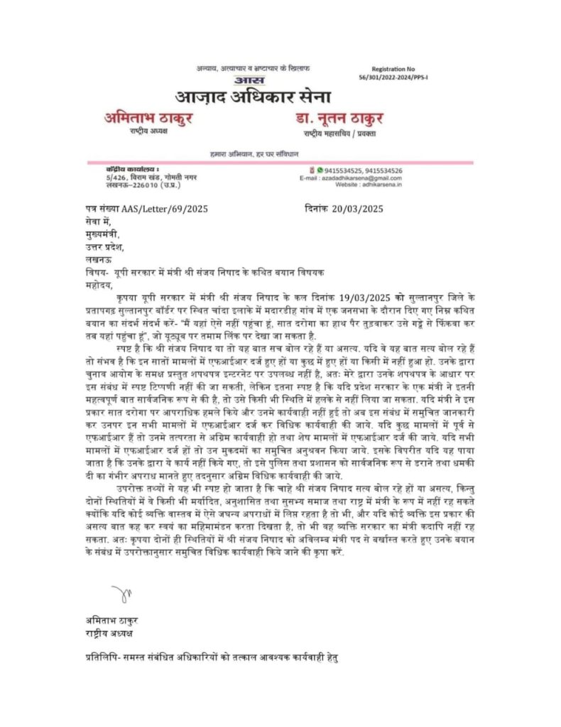 आजाद अधिकार सेना के राष्ट्रीय अध्यक्ष अमिताभ ठाकुर ने मंत्री संजय निषाद द्वारा सात दरोगाओं का हाथ पांव तोड़ने के दावों के संबंध में समुचित विधिक कार्रवाई तथा उन्हें मंत्रिमंडल से बर्खास्त किए जाने की मांग की है।