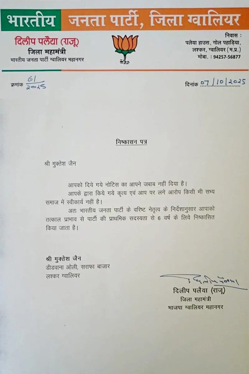 भाजपा जिला महामंत्री की ओर से जारी निष्कासन पत्र में आरोपी मुक्तेश जैन से कहा गया है कि, नोटिस का जवाब न देने और किए गए कृत्य के आरोप को सभ्य समाज में स्वीकार्य न होने के चलते पार्टी द्वारा तत्काल प्रभाव से आपको 6 वर्ष के लिए निष्कासित किया जाता है।