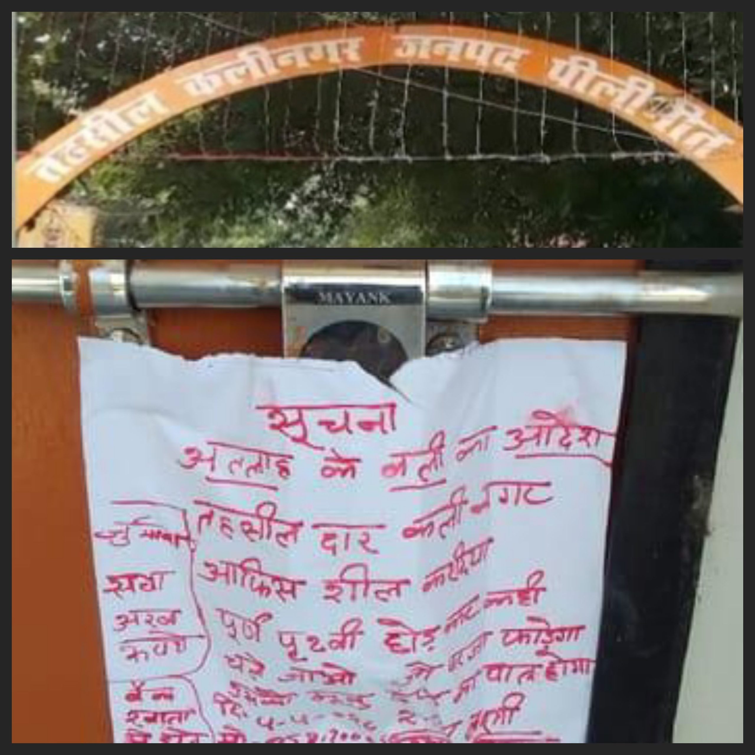 पीलीभीत के कलीनगर तहसीलदार कार्यालय में मंगलवार सुबह उस समय हलचल मच गई, जब रोज की तरह दफ्तर खोलने पहुंचे कर्मचारियों की नजर गेट पर चस्पा कागज पर पड़ी। कागज पर लाल कलम से जो संदेश लिखा था उसने कर्मचारियों को हैरत में डाल दिया। उस पर लिखा था कि “यह अल्लाह के वली का आदेश है। तहसीलदार कार्यालय को सील कर दिया गया है।”